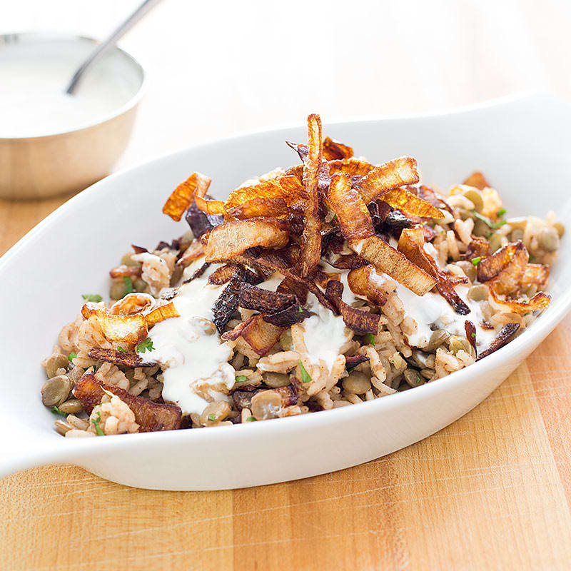 Mujaddara, the rice and beans of the Middle East, is a hearty one-dish vegetarian rice and lentil pilaf containing large brown or green lentils and crispy fried onion strings. For the pilaf, we found that precooking the lentils and soaking the rice in hot water before combining them ensured that both components cooked evenly. We pare down the typically fussy process of batch-frying onions in several cups of oil to a single batch of onions fried in just 1 1/2 cups of oil. The trick: removing a good bit of the onions’ water before frying by tossing them with salt, microwaving them for 5 minutes, and drying them thoroughly.